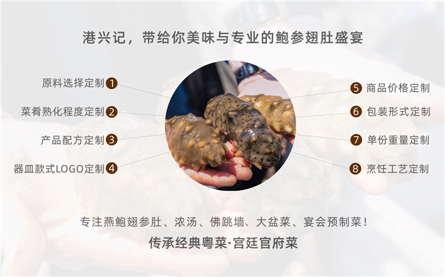 干鮑魚(yú)、干海參經(jīng)過(guò)泡發(fā),使鮑魚(yú)、海參肉壁細(xì)胞吸水舒展,便于營(yíng)養(yǎng)物質(zhì)的吸收,再加入其他珍貴食材、古法熬燉十余小時(shí)的湯汁,烹制成那令人贊不絕口的港興記鮑魚(yú)、海參、佛跳墻等系列美食。
